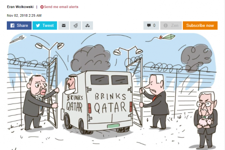 ووفقا للكاريكاتير، فإن رئيس الوزراء الإسرائيلى بنيامين نتنياهو، ووزير الدفاع أفيجدور ليبرمان، يسمحان بمرور عربة محملة بالأموال لقطاع غزة يقودها أمير قطر تميم بن حمد آل ثانى الداعم الأكبر للإرهاب فى منطقة الشرق الأوسط.