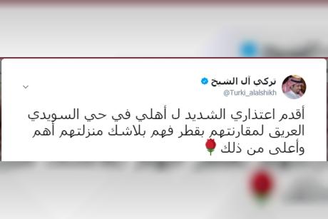 وكتب آل الشيخ عبر حسابه على موقع "تويتر" أمس الثلاثاء: "أقدم اعتذاري الشديد لأهلي في حي السويدي العريق لمقارنتهم بقطر فهم بلا شك منزلتهم أهم وأعلى من ذلك. وعلى فكرة بيت جدي وخوالي في السويدي".